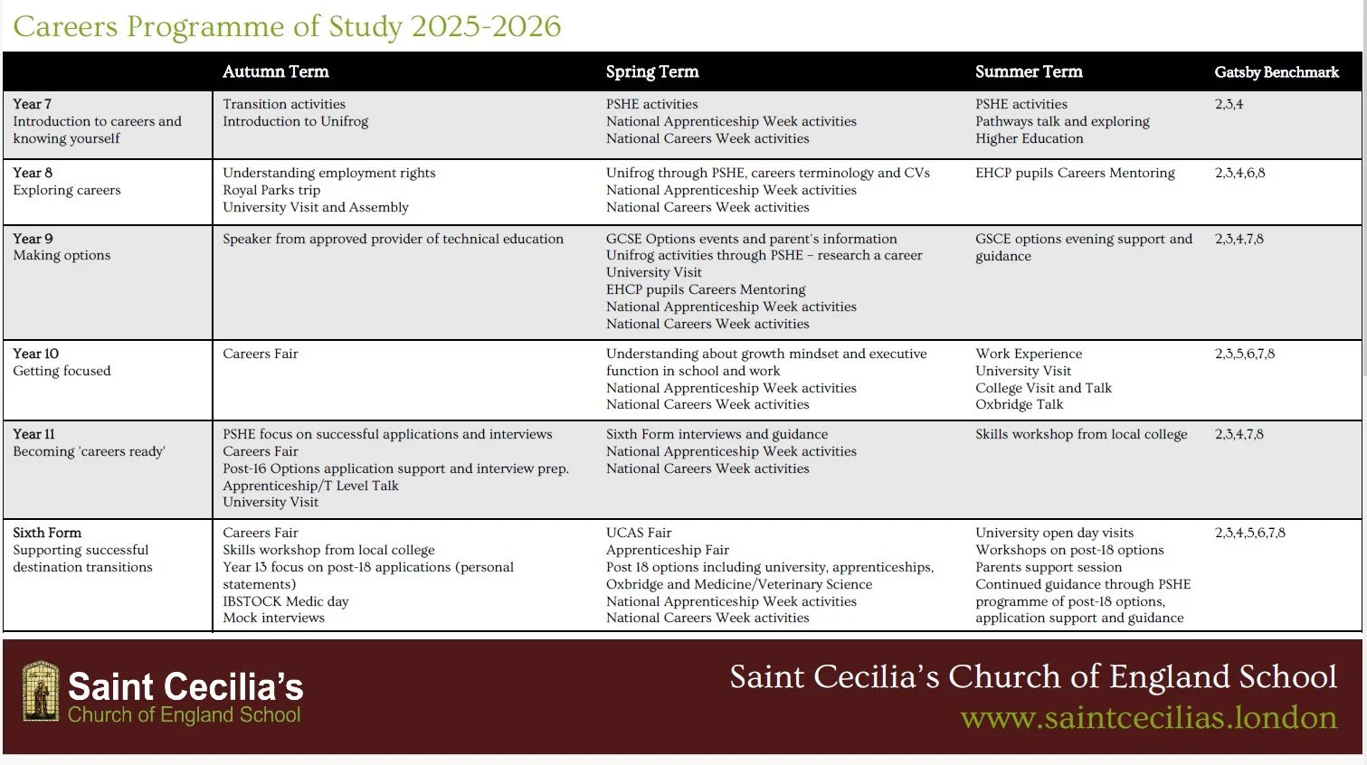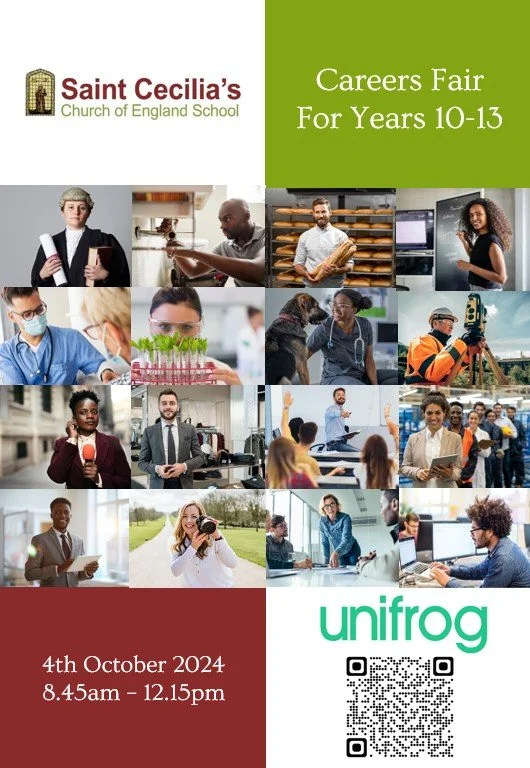 At Saint Cecilia’s we deliver an inclusive, dynamic and aspirational careers programme that aims to provide the best opportunities and chances for our pupils and students. All staff contribute to Careers Education, Information, Advice and Guidance (CEIAG) through their roles as mentors, subject teachers, curriculum/subject leaders, and Heads of Year. It is delivered through five strands: the curriculum, the pastoral team, trips, encounters with employers and through pathways to GSCEs, post Year 11 and post Year 13 education and training. The school incorporates the eight Gatsby Benchmarks and the Career Development Framework into its careers programme. The aim of the Saint Cecilia’s Careers programme is to support all pupils and students to be self-reflected, encourage career curiosity, be aware of the opportunities available and investigate them, in turn enabling career and education decisions to be made with confidence aligned to each pupil and student needs and aspirations.